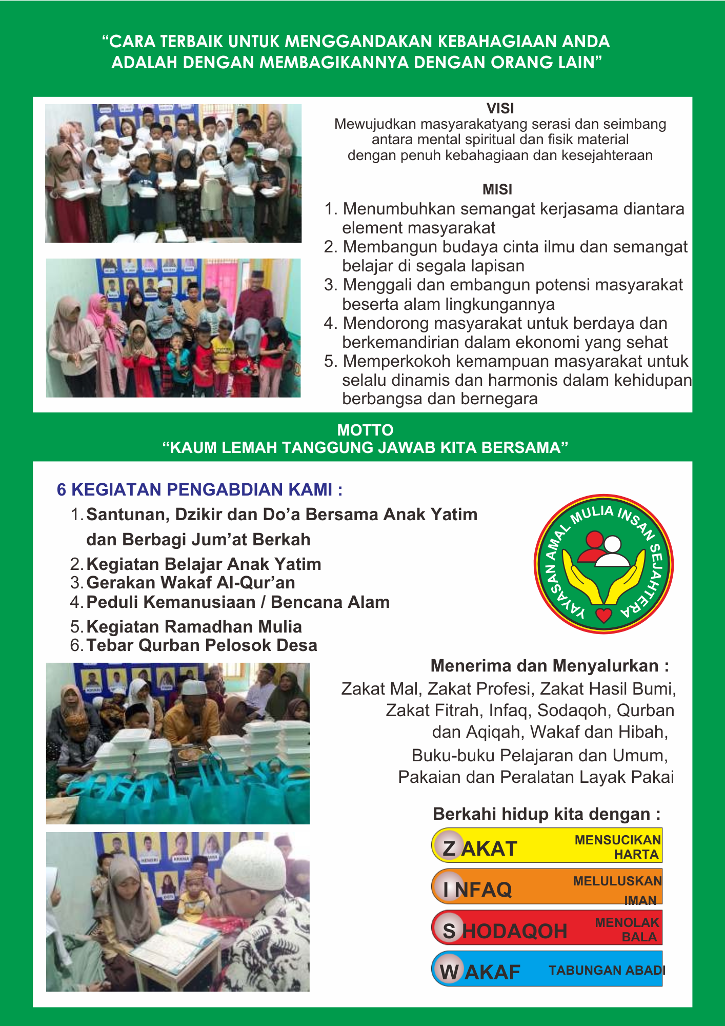 Yayasan Amal Mulia Insan Sejahtera memiliki visi, misi, motto, dan kegiatan pengabdian yang berfokus pada kesejahteraan masyarakat dan pengembangan spiritual.